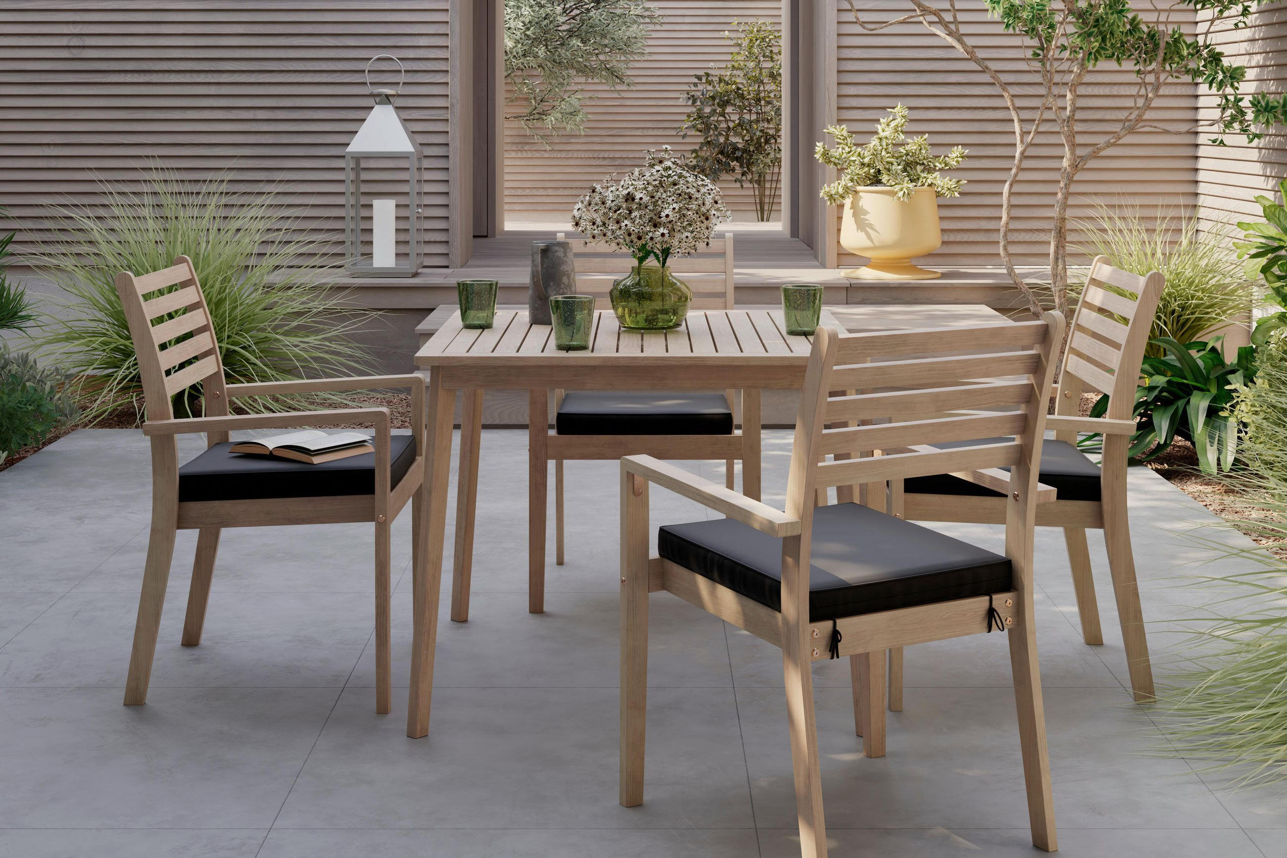Da bi opuštanje u vrtu tijekom dana bilo potpuno, potrebno je i napraviti mjesto u hladu. Velik suncobran osigurava potrebnu sjenu i naglašava moderan izgled. Za dodatnu udobnost brinu jastučići u neutralnim bojama.