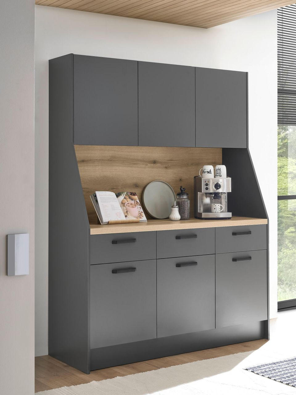 Ultra moderna kombinacija boja te dizajn bez ručkica oduševit će vas na prvi pogled! Antracit i boja hrasta savršeno se nadopunjuju. Na raspolaganju su 3 velike ladice, element za ugradbeni hladnjak i pećnicu te viseći element. Predviđen je i prostor za ugradbenu perilicu posuđa. Idealna kuhinja za moderan stambeni prostor!
