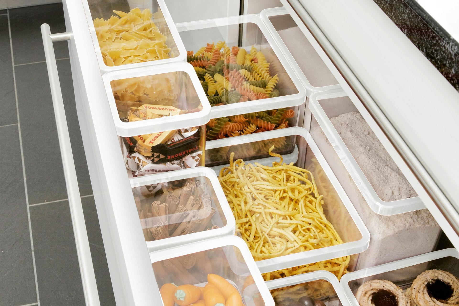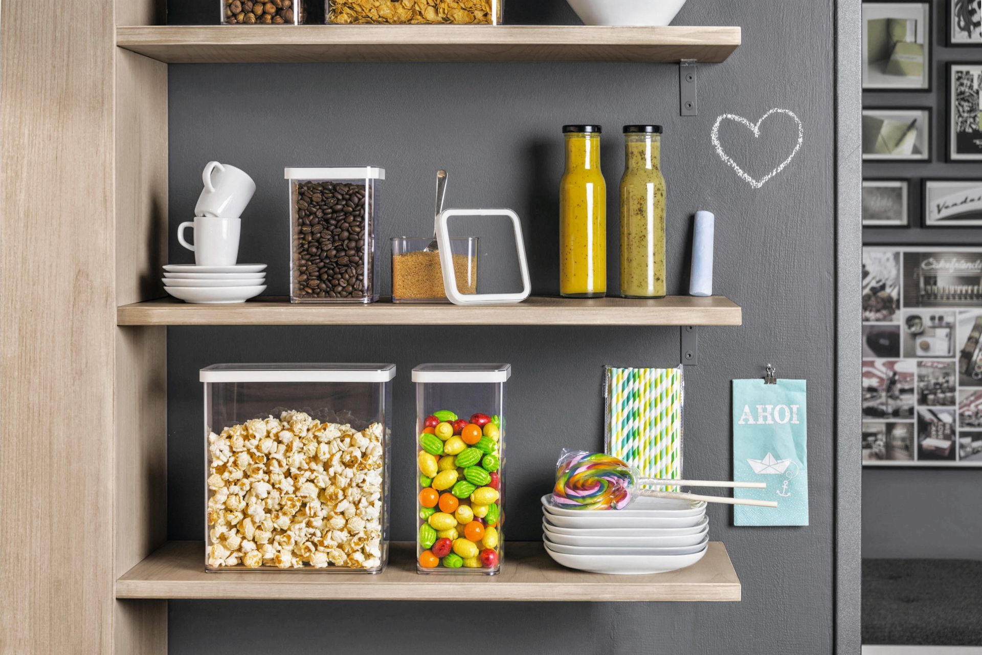 Začine, tjesteninu i druge potrepštine držite u posebnim posudama za čuvanje hrane koje možete pohraniti u ormarić iznad štednjaka gdje će vam biti lako dostupni prilikom kuhanja. U gornjim kuhinjskim elementima možete držati i veće predmete poput daski za rezanje i serviranje, velikih kuhinjskih noževa i vrčeva. Umjesto zatvorenih visećih elemenata možete postaviti police koje će biti jednako učinkovito rješenje za pohranu. Zahvaljujući otvorenom konceptu, prostor će izgledati prozračno, a police će dati zanimljiv izgled cijeloj kuhinji.