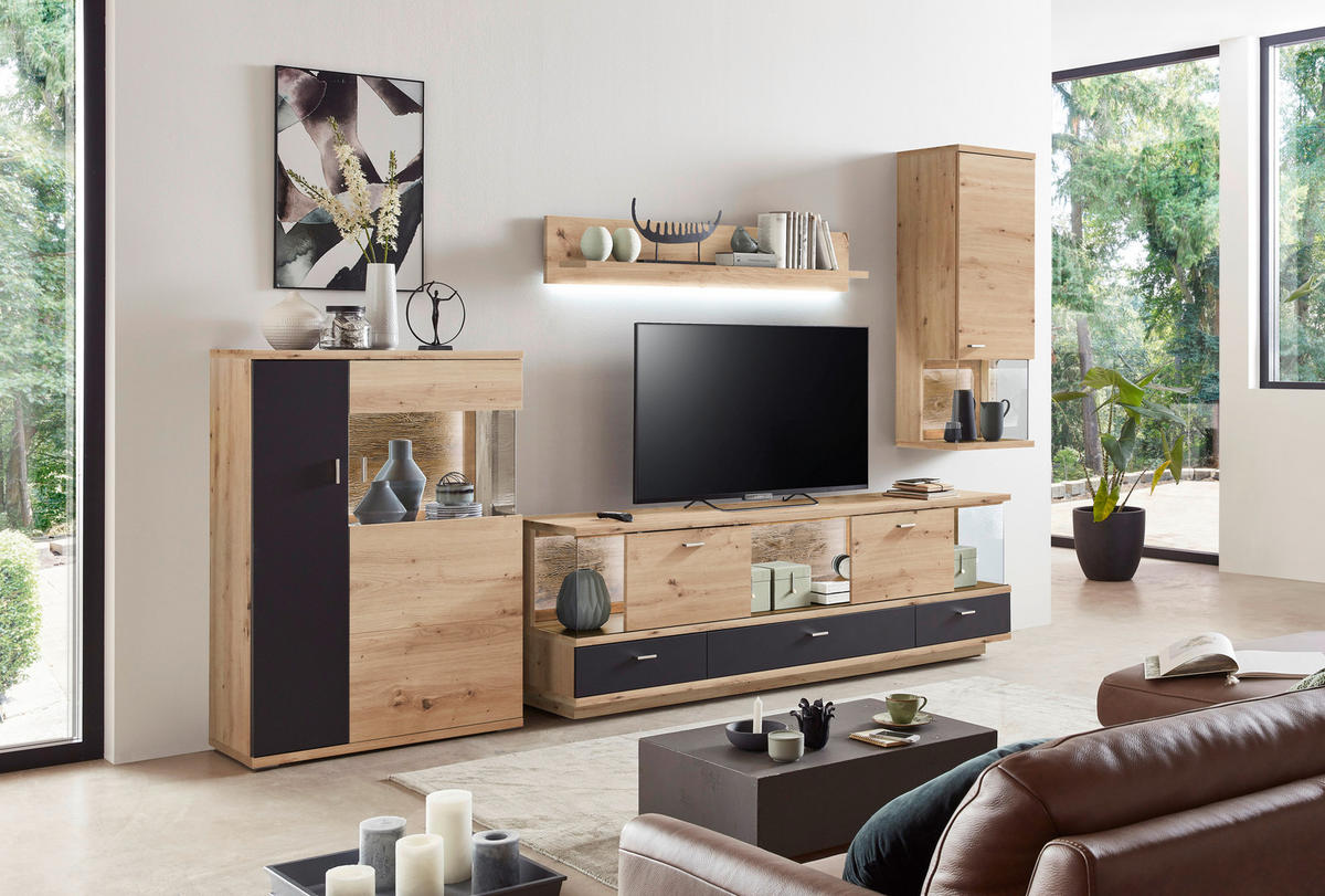 REGAL ZA DNEVNI BORAVAK boje hrasta, tamno siva   - srebrne boje/boje hrasta, Design, staklo/drvni materijal (324,6/204,2/45cm) - StylifeStylife